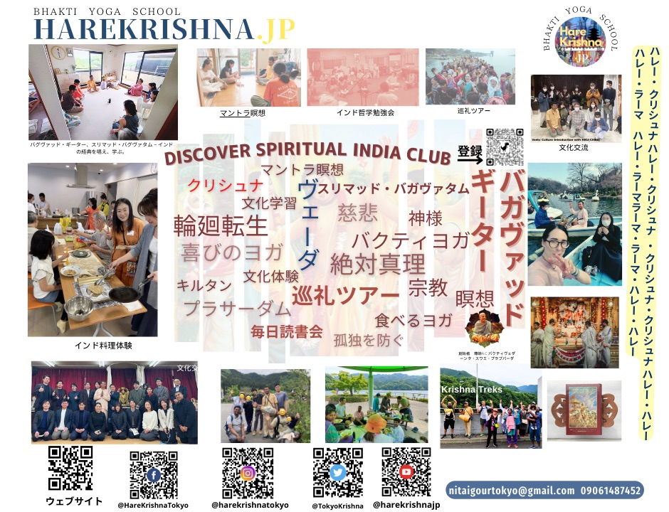 日本で最も純粋な形でヴェーダーンタとバガヴァッド・ギーターの哲学を教えています。人々がクリシュナ意識を理解し、幸せになるために、定期的に情報を共有し、下北沢でイベントを開催している協会です。ジョージハリスンが言うように「誰もがクリシュナを探している。ある者は自分がそうであることに気づいていない.